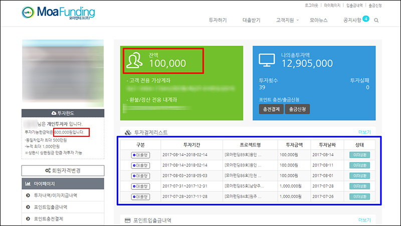 누적 최대 1000만원을 거의 다 채운 상태이기에 모아펀딩에 거는 기대는 꽤 큰 편입니다. 앞으로 모아펀딩을 통해 투자 상환금을 받아 어느정도 투자한 자금이 귀환되면 따로 후기를 작성하여 성과를 리포트해보도록 하겠습니다. 요즘에는 연체되고 있는 건들이 많아서 조금 걱정이네요. :)