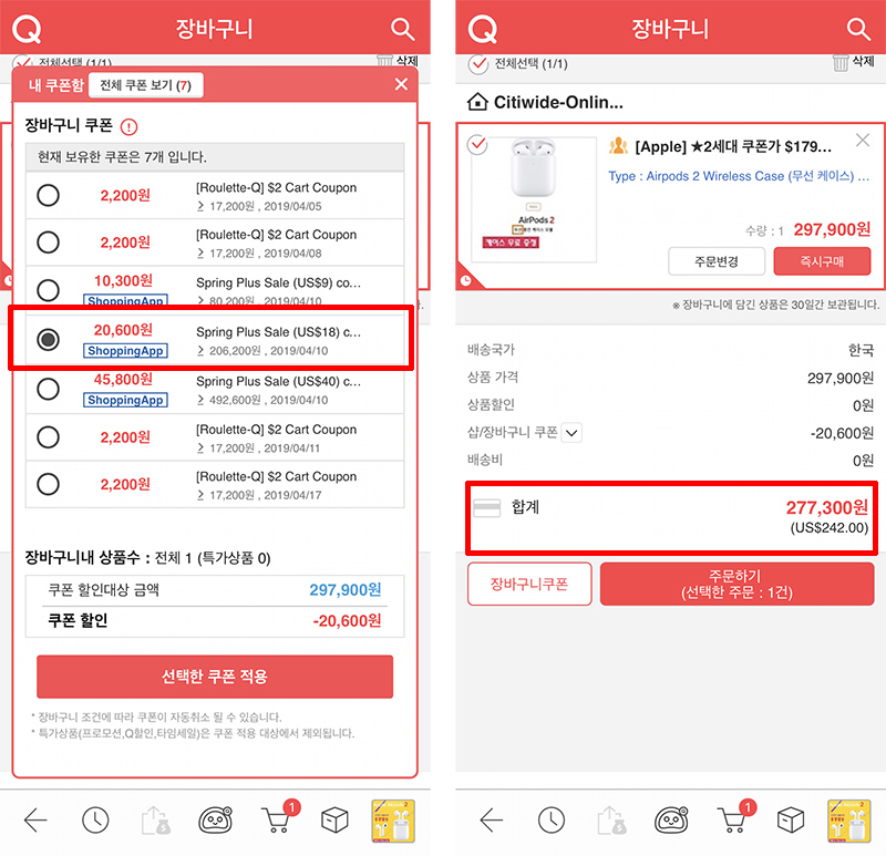 가격은 무선 케이스를 하면 29만원이 살짝 넘고, 그냥 유선 충전 케이스면 22만원이 조금 넘는데요. 잘 아시다시피 큐텐은 장바구니에 담아두고 앱 모바일 쿠폰을 적용하면 더 저렴해집니다.