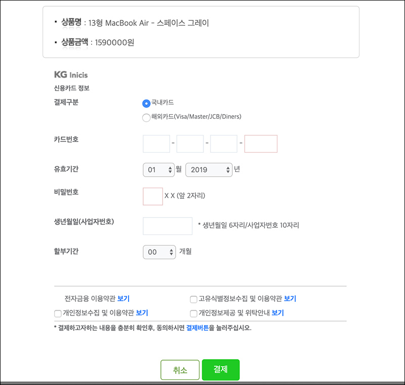 결제를 KG이니시스를 통해 결제됩니다. 맥(Mac)에서는 크롬 브라우저에서 카드정보만 입력하면 결제가 됩니다. 윈도우에서는 크롬이 아닌 익스플로러에서만 되는 것으로 알고 있습니다.