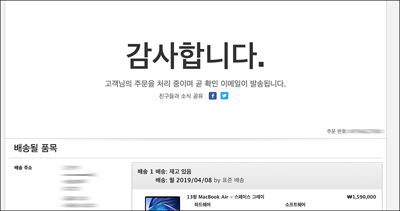 위와 같은 화면이 나왔다면 구입이 완료된 것입니다. 이제 기다리는 일만 남았네요. 아니면 애플스토어 가로수길에서 당일 픽업도 가능합니다. :)