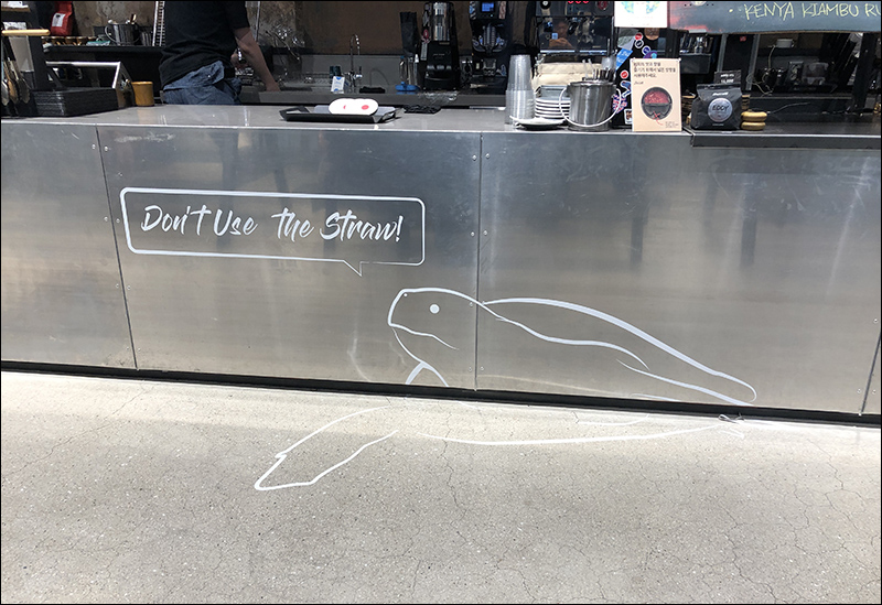자세히 보시면 인상적인 것은, 카운터에 바다거북이 그려져 있어요. 그리고 Don't use the Straw 라고 쓰여져 있네요 ^^