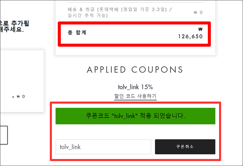 입력 란이 뜨고, 여기에 tolv_link 라고 적은 뒤 쿠폰 적용 버튼을 누르면 된다. 그러면 꽤 할인된 가격으로 구입할 수 있다는 것을 알 수 있다. ^^