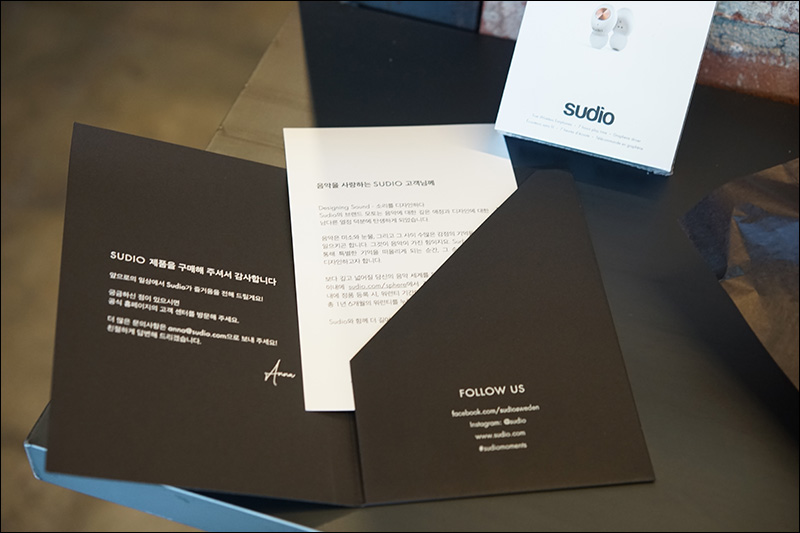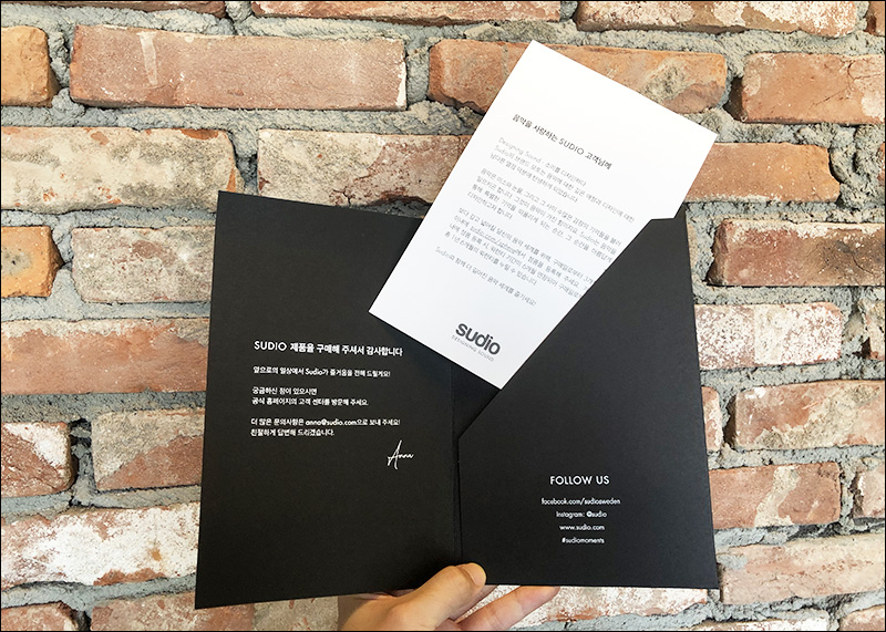 위와 같이 구입을 감사한다는 카드편지와 함께 스웨덴 음향기기 제조업체인 수디오 브랜드에 대한 간략한 설명이 들어있다. 이는 비츠, 슈어 등 프리미엄을 추구하는 대다수의 음향기기제조업체가 사용해온 방식인데, 수디오도 이제 패키지에서 이러한 감성을 느낄 수 있다.