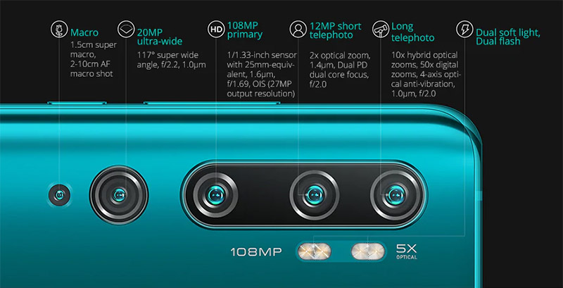 1억 8백만 화소, 초광각과 접사 카메라 등, 5개의 렌즈를 가진 샤오미 미노트10이 얼리어답터들 사이에서 가장 큰 이슈를 불러일으키고 있다.