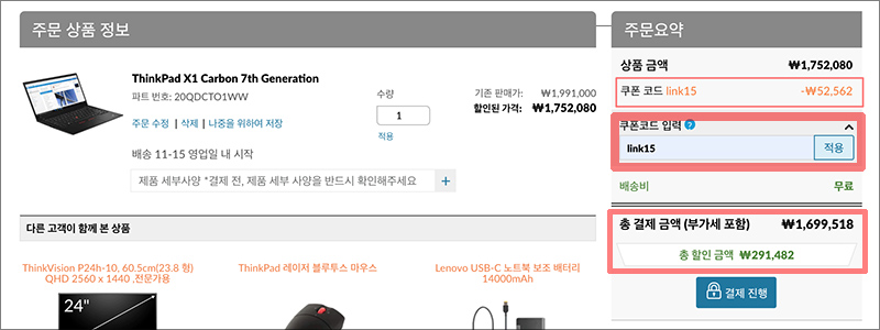 엄청난 할인... 원래 정가 기준으로는 191만원이지만, 쿠폰코드 입력란에 'link15'를 입력한 순간 블프 할인 + 추가할인이 됩니다. 씽크패드 모델은 최대 22% 할인이 되는거죠 ^^ 씽크패드 노트북을 구입하려고 했던 분들은 꼭 이번 기회에 구입하시는 것이 좋겠습니다.