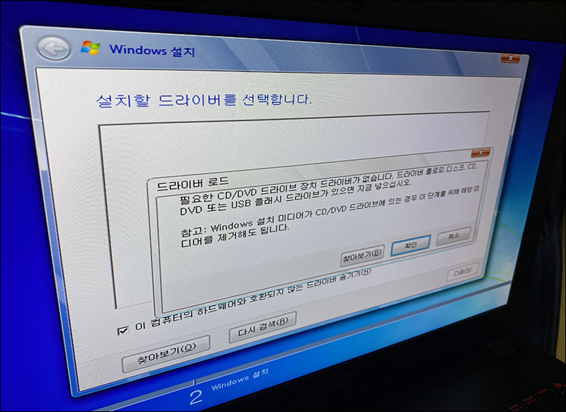 DVD-ROM ODD로 설치하는 것이 더 쉬운 경우도 있습니다. USB 3.0 드라이버가 없어서 USB 2.0에 일부러 꽂아 설치해야 하는 경우도 있구요.