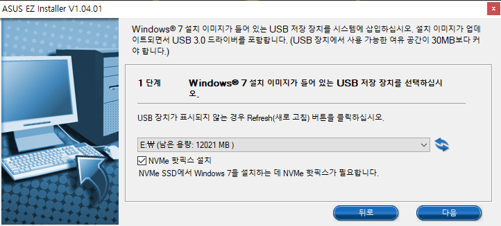 이미 다른 컴퓨터에서 Windows7 인스톨용 USB를 만들어두셨다면... 위에 보이는 것처럼 편하게 Fix 패치를 적용시키면 되죠.