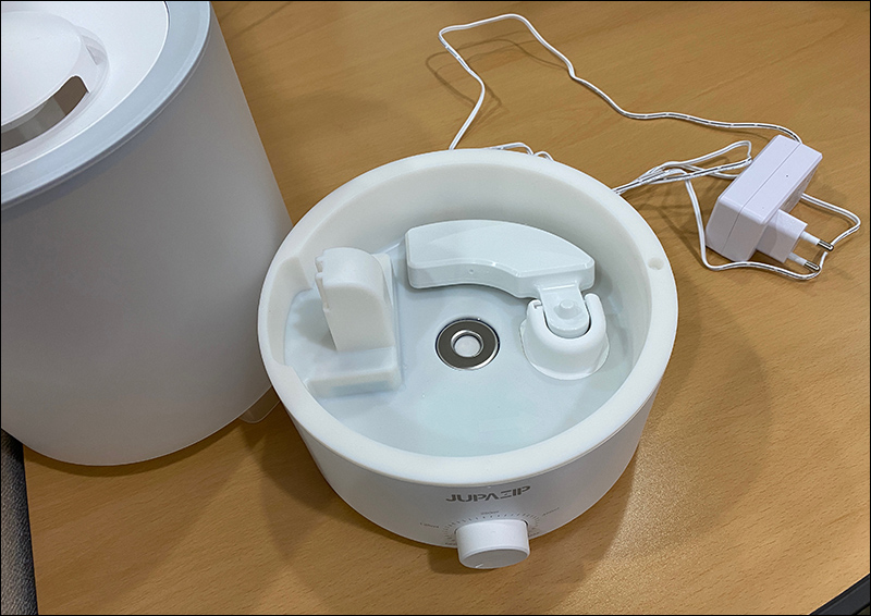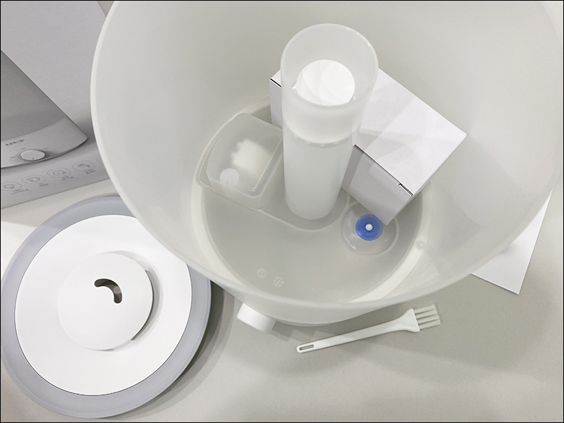 4L를 담을 수 있는 물통을 드러내보면... 아래쪽에는 아래과 같은 초음파 가습기 구조가 되어 있습니다. 플로터 부분에 보호를 위한 스펀지가 있으니 이걸 제거하고 사용하시면 될 것 같네요.