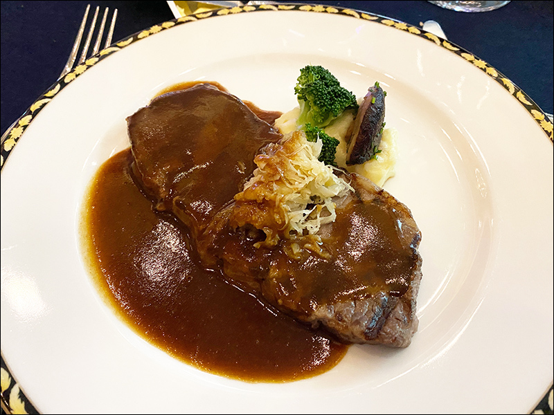 저녁식사 (디너) 메뉴는 에피타이저, 수프, 등심 스테이크, 그리고 디저트 -> 커피 순이네요.