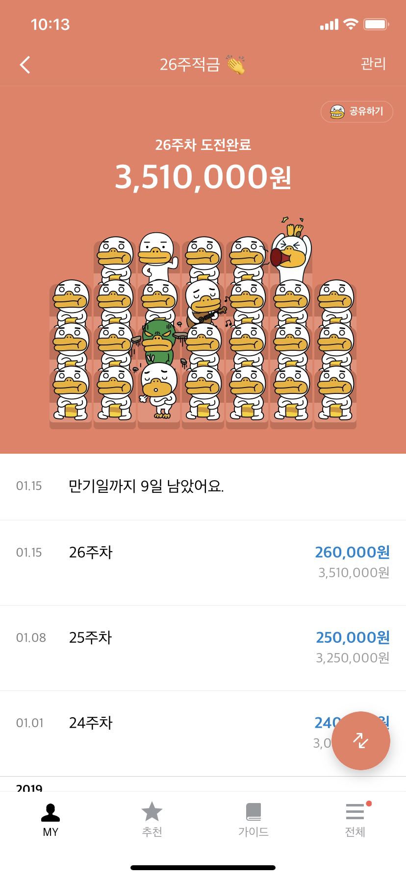 이자수익을 위해 매주 10만원씩 증액해서 351만원을 모아온 것이죠. :)