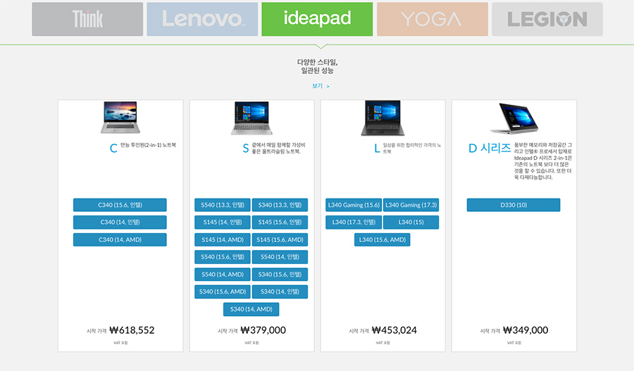 원하는 모델을 브라우징 해도 됩니다만 일단 가장 인기 있는 아이디어패드 S340 15인치 모델을 기준으로 얼마나 할인이 이루어지는 살펴볼까요?