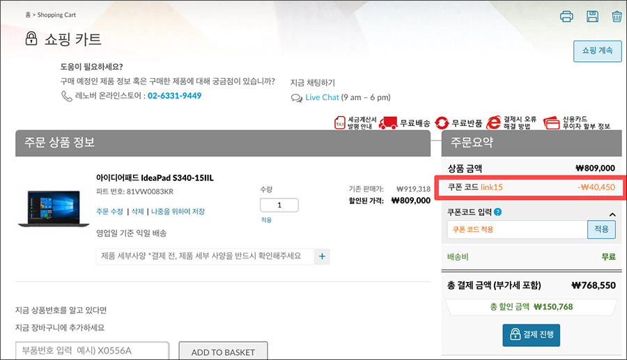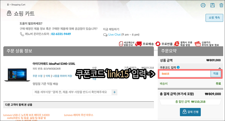 씽크패드나 아이디어패드, 요가북 등등에 제품에 'link15' 쿠폰코드를 입력하면 추가할인이 이루어집니다 :)