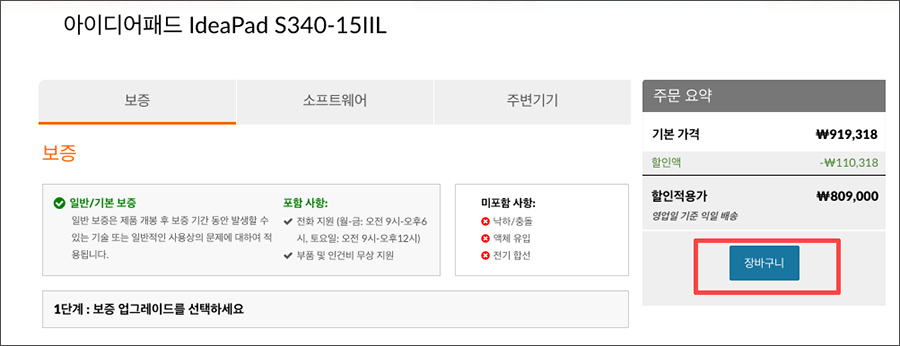 장바구니에 담고 넘어가볼까요? 그러면 할인 쿠폰코드를 입력하는 란이 오른쪽 주문요약란에 있는 것을 확인할 수 있습니다.