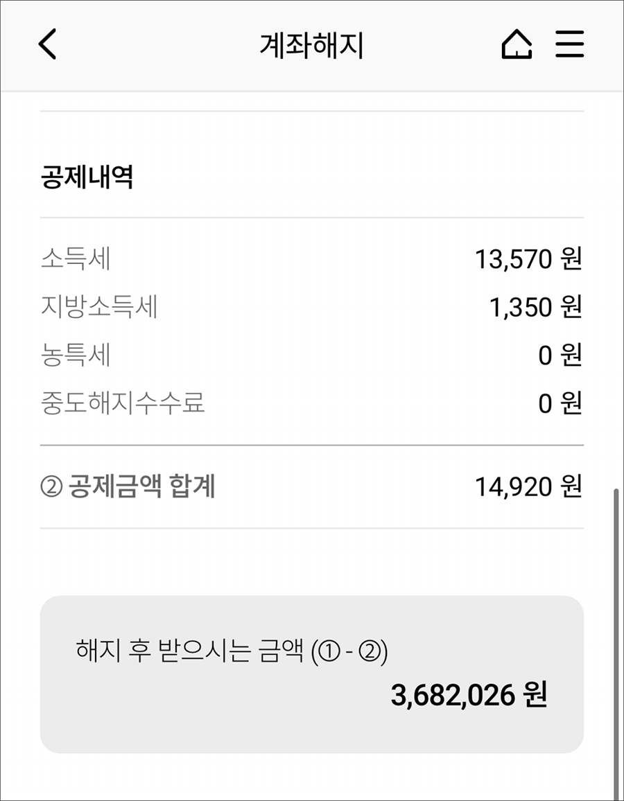 세전 3,696,946원이지만, 소득세와 지방소득세를 제하고 들어온 이자는 82,026원 입니다. :)