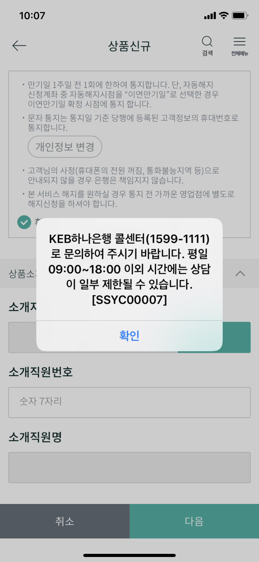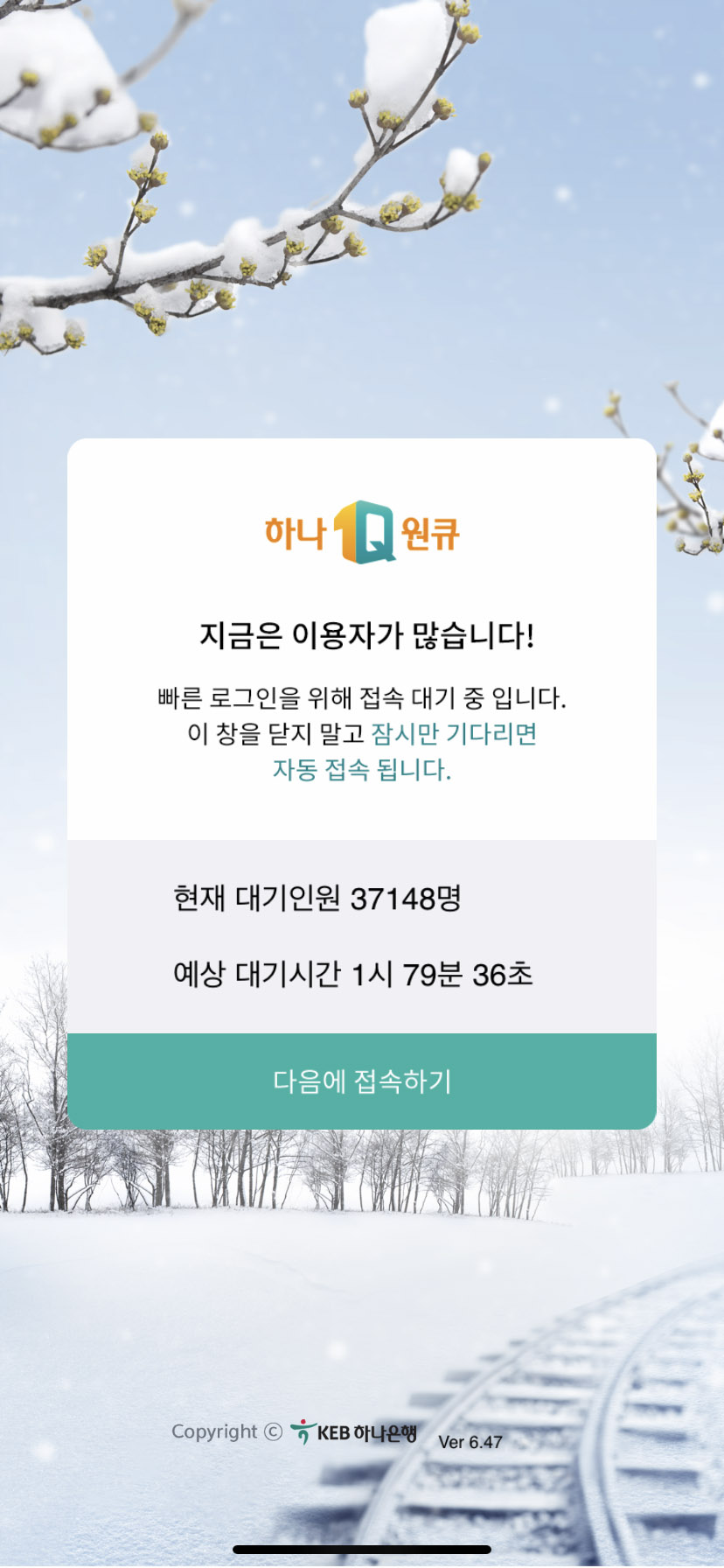 왼쪽 처럼 팝업 에러가 뜨면서 콜센터로 문의해야 한다고 SSYC00007 에러가 뜨네요. 그래서 처음부터 다시 해야 하나... 다시 접속해보니 대기인원 3만 7000명이 넘고... 1시간 79분(?) 기다려야 모바일 뱅킹 접속이 가능하다고...