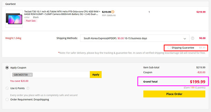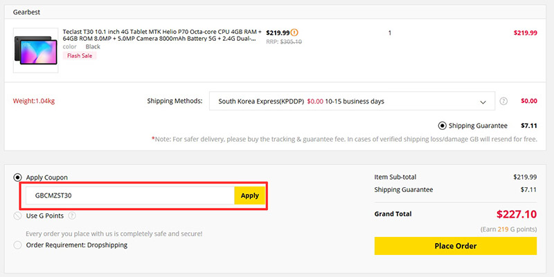 본래 가격은 219.99$ 인데 한국으로 배송하면서 보험을 들게 되면 7.11$가 추가가 되네요. 227.10$입니다. 여기에 공유해드린 쿠폰코드를 입력한 뒤 Apply 버튼을 눌러보면...