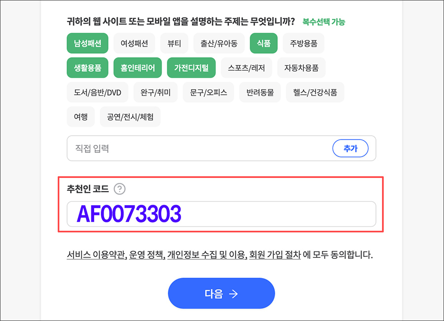 자 그럼 기본정보를 입력하고 회원강비을 하실 때, 추천인 코드가 필요 합니다. 추천인 코드는 AF0073303을 입력해주세요 :)
