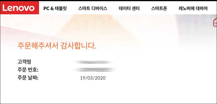 아무튼, 제가 레노버 씽크패드 T495를 결제 완료한 주문한 일자는 2020년 3월 19일입니다.