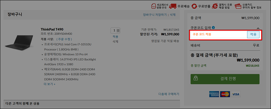 자 이제 최저가로 씽크패드를 주문 구매하는 방법을 알려드리겠습니다. 먼저 레노버 공홈으로 이동해서 저처럼 원하는 씽크패드 모델을 고르고, 결제 전 장바구니에서 우측 상단에 있는 쿠폰코드 입력란을 확인합니다.