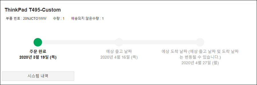 아무튼, 제가 레노버 씽크패드 T495를 결제 완료한 주문한 일자는 2020년 3월 19일입니다.