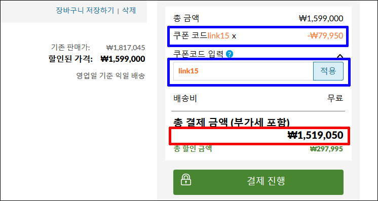 'link15'를 소문자로 입력하시면 됩니다. 할인코드를 적용시키면 얼마나 더 할인이 될까요?
