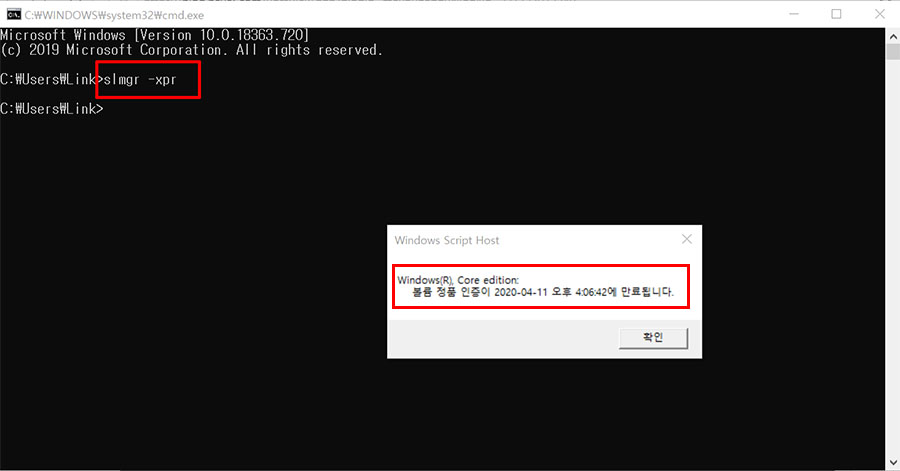 위와 같이 입력하고 엔터키를 누르면, 윈도우의 라이센스 상태를 알 수 있습니다.