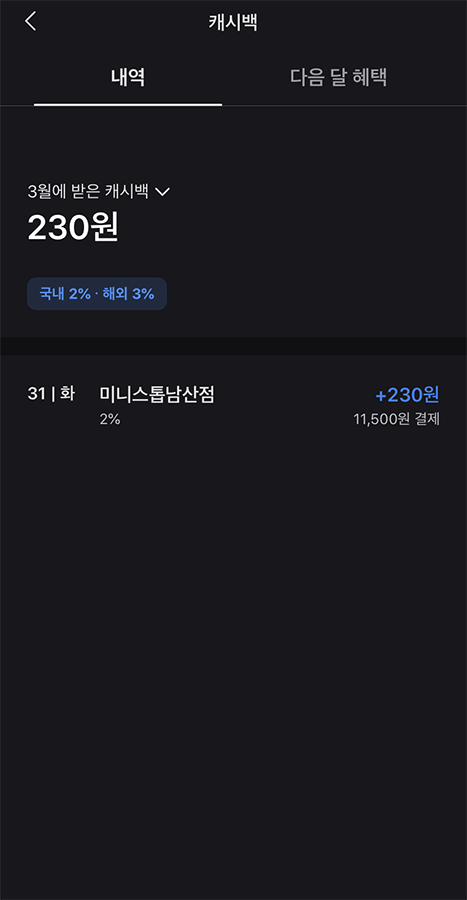 혜택 기능을 살펴보면, 특별할 것은 없지만... 2% 토스머니 환급 할인이라는 꽤 높은 혜택을 주는 카드입니다. 해외 이용시에도 2% 캐시백 환급이 가능하구요.