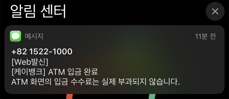 여기서 한가지, 인터넷에 이미 널리 후기가 남겨져 있지만, ATM에서 나오는 수수료금액은 실제로 부과되지 않습니다. 제가 직접 보여드리기 위해 일단 적금에 모두 입금하고 잔고를 0을 만든 뒤, 5만원을 입금해봤습니다. 위에 사진에는 700원이 수수료로 부과된다고 나오죠? 그런데 실제로는 부과되지 않습니다. 아래와 같이 SMS로도 공지가 되고 있는 부분이죠.