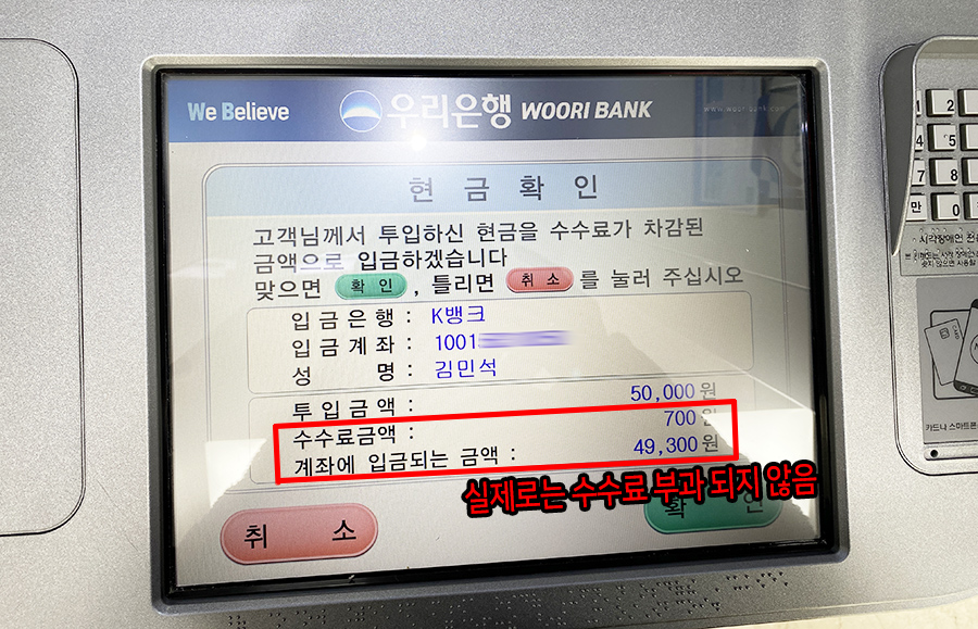 여기서 한가지, 인터넷에 이미 널리 후기가 남겨져 있지만, ATM에서 나오는 수수료금액은 실제로 부과되지 않습니다. 제가 직접 보여드리기 위해 일단 적금에 모두 입금하고 잔고를 0을 만든 뒤, 5만원을 입금해봤습니다. 위에 사진에는 700원이 수수료로 부과된다고 나오죠? 그런데 실제로는 부과되지 않습니다. 아래와 같이 SMS로도 공지가 되고 있는 부분이죠.