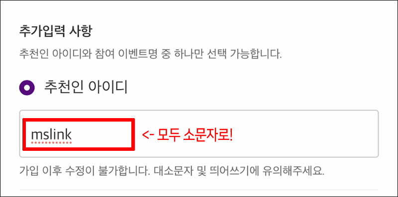 웹에서 회원가입을 할 때나, 모바일 마켓컬리 앱에서 가입을 할 때, '추천인 아이디'를 입력하시는 거 잊지 마세요 ^^ 모두 소문자로 'mslink'를 입력해주시면 서로 적립금 5000원씩 나눠가질 수 있기에 공유해봅니다. :)