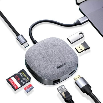 위에서 볼때는 이 제품이 USB-C 허브가 맞는지 궁금할 정도로 예쁩니다. 역시 7in1 허브로 USB PD 포트 60W 충전, 4K HDMI, 유선랜, USB 3.0 포트 2개, 메모리카드 리더기 등을 지원합니다.