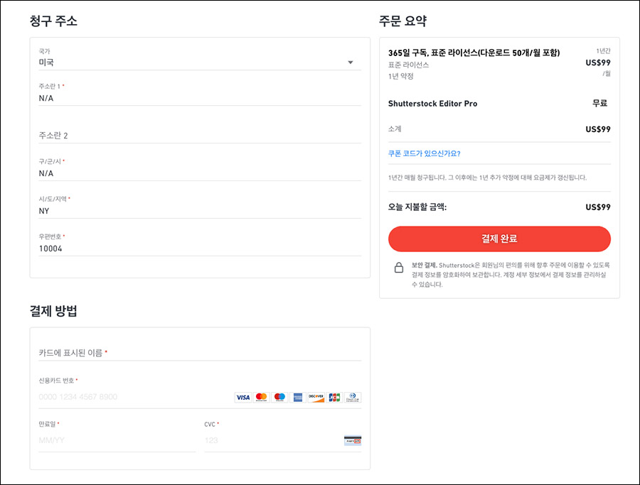결제를 미국 달러 기준으로 되기에, 해외 결제가 되는 신용카드나 체크카드를 선택해야 합니다. 주소지는 정확하게 모두 입력할 필요는 없지만, 되도록 한국에 있는 주소를 자세히 기입해주는 것이 좋겠죠.