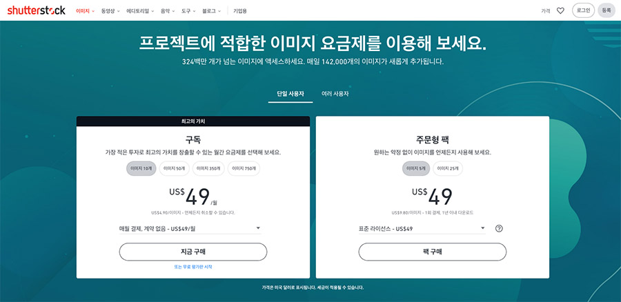 구독형 플랜 중 효율은 월 이미지 50개가 가장 좋아보입니다. 계약을 하지 않아도, 일단은 49$ (+세금)에 이미지 50개를 다운로드 받을 수 있어서... 이미지 한개당 약 2.5$라는 계산이 나오죠. 여기서 년간 계약을 하게 되면 조금 더 저렴해집니다.