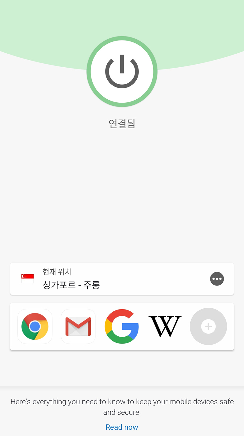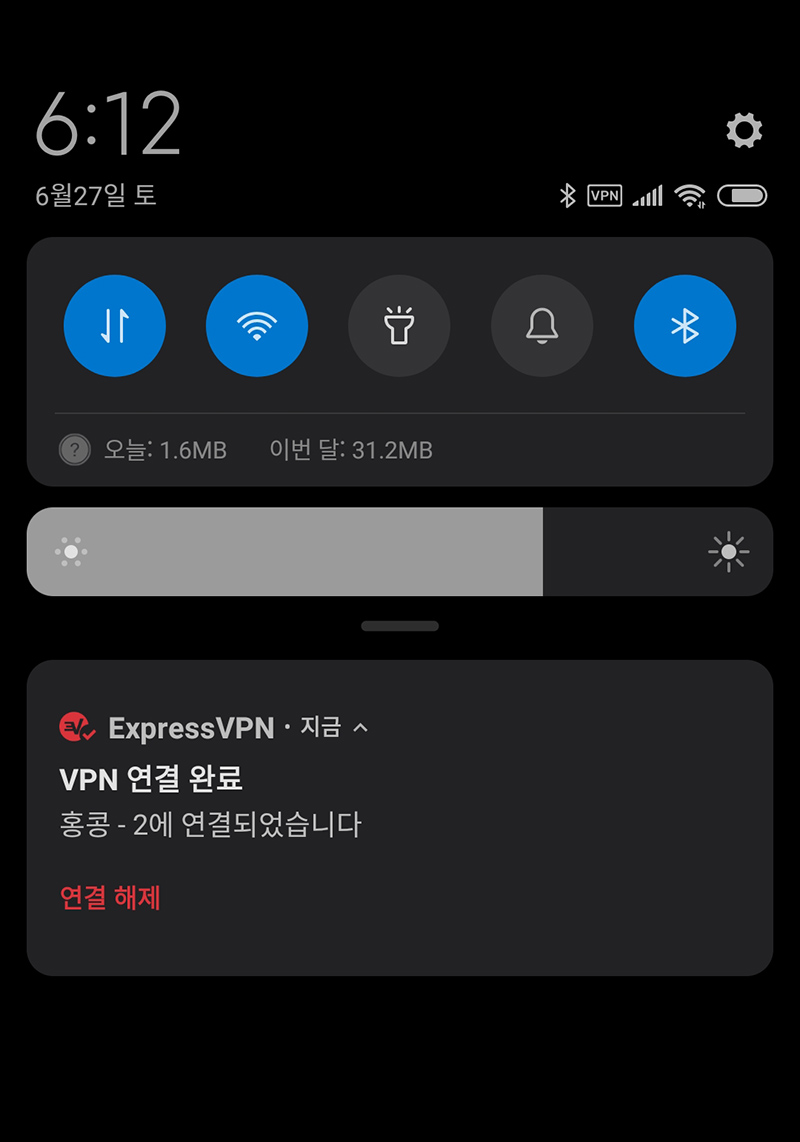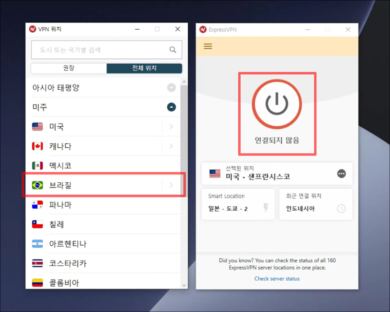 저는 브라질을 선택해봤습니다. 지역을 선택하면 바로 연결이 되고, 연결/비연결을 제어하려면 가운데 파워 스위치를 클릭하면 됩니다.