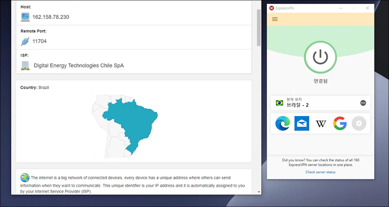 브라질 인터넷으로 연결된 화면입니다. myip로 확인을 해보니, 저는 이제 브라질에서 인터넷을 사용하고 있네요. 이렇게 VPN을 사용하는 이유는 여러가지가 있지만, 가장 우선적으로는 보안을 위해서 사용을 하죠 ^^