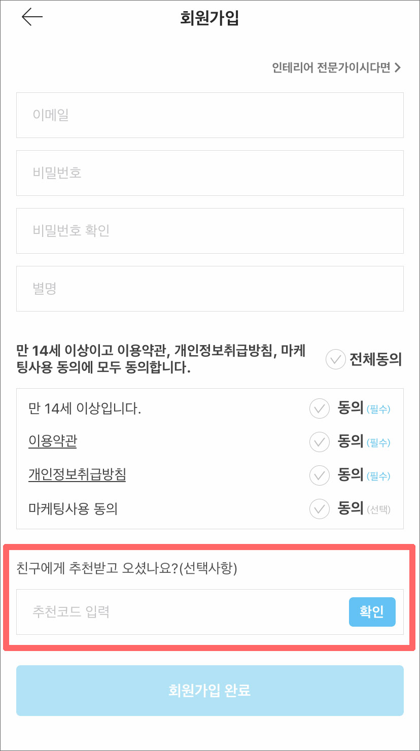 이메일로 간단하게 가입이 가능한데, '회원가입 완료' 버튼을 누르기 전에 '친구에게 추천받고 오셨나요?' 라고 쓰여져 있는 '추천코드 입력'란에 추천코드를 꼭 입력합니다. 넘어가 버리면 다시 기회가 없어요 ^^