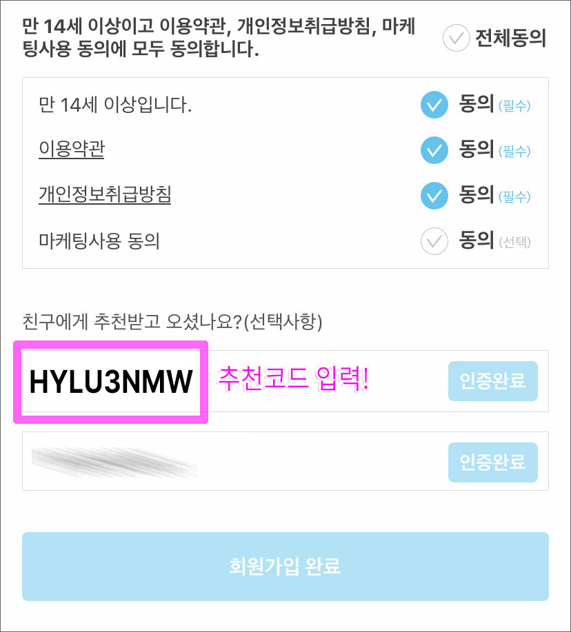 위와 같이 추천코드 HYLU3NMW을 모두 대문자로 입력하고 인증 완료 후 회원가입을 완료하시면 5000포인트를 추가로 얻을 수 있습니다.