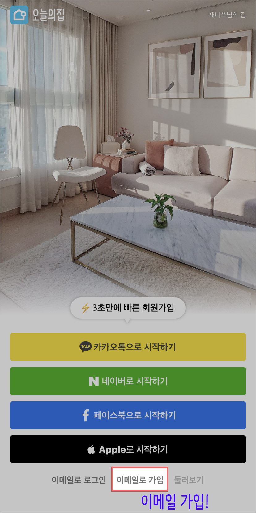 카카오톡이나 네이버 아이디로 회원가입을 할 수도 있지만, 관리를 편하게 하기 위해서는 자주 사용하시는 이메일 주소로 회원가입을 하시는 것이 좋습니다. 잘 찾아보면 이메일로 가입하기 버튼이 있습니다. :)