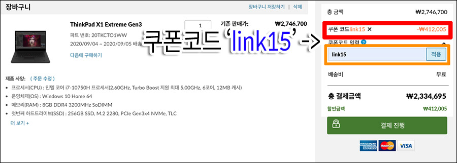 씽크패드 노트북을 저렴하게 구입하는 법: 할인코드 'link15' 적용해 구입하기