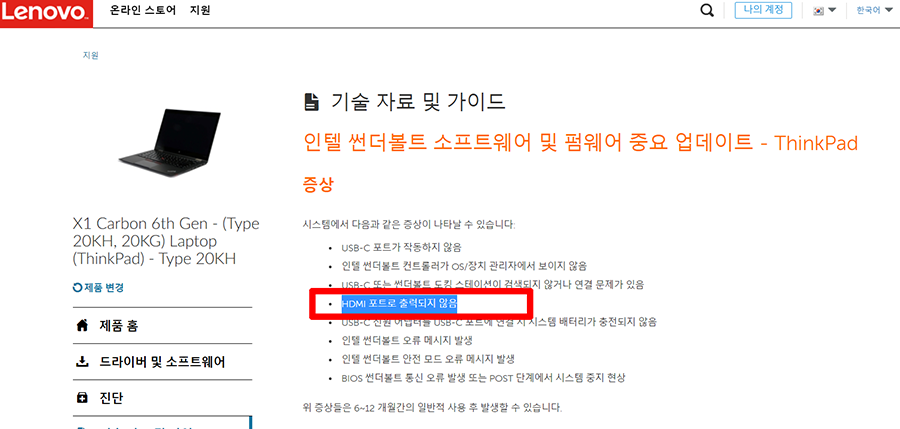 자세한 내용을 보니, USB-C 포트가 먹통이 되거나, HDMI 포트로 출력되지 않거나, 썬더볼트가 작동하지 않거나 등등... 딱 제가 겪고 있는 문제점들이더군요. 제 경우에는 씽크패드 X1 카본 6세대 모델이지만, 다른 세대 모델들도 비슷한 문제점이 나와서 패치 안내가 되고 있는 듯 합니다. 정확한 기술 문서 페이지는 '인텔 썬더볼트 소프트웨어 및 펌웨어 중요 업데이트 - ThinkPad'입니다.