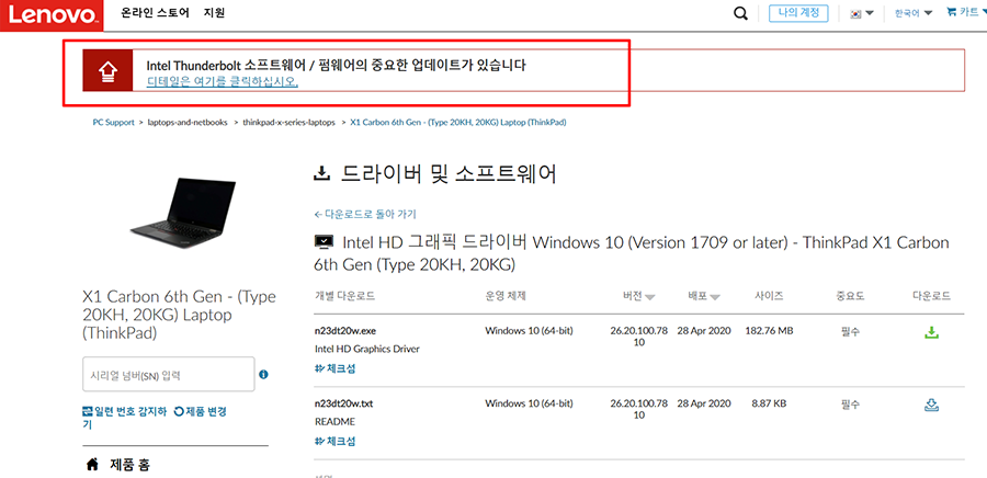 제 경우에는 씽크패드 X1 카본 6세대를 사용하고 있어서, 드라이버 다운로드 페이지의 위와 같이 'Intel Thunderbolt 소프트웨어 / 펌웨어의 중요한 업데이트가 있습니다'라고 쓰여져 있었습니다.아래와 같은 안내가 있더군요.