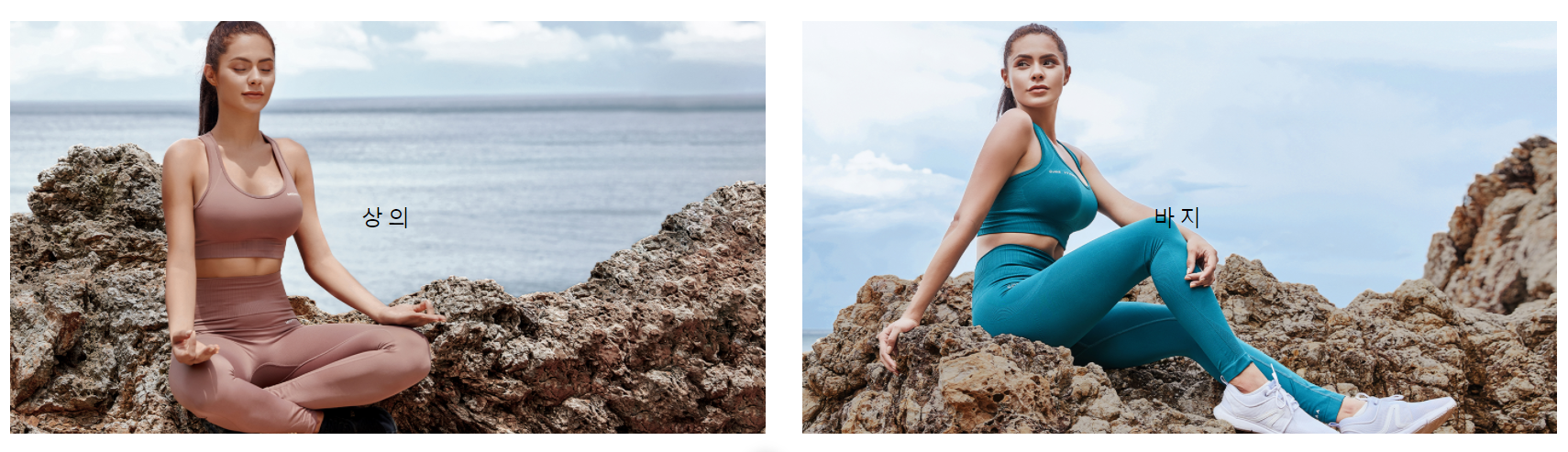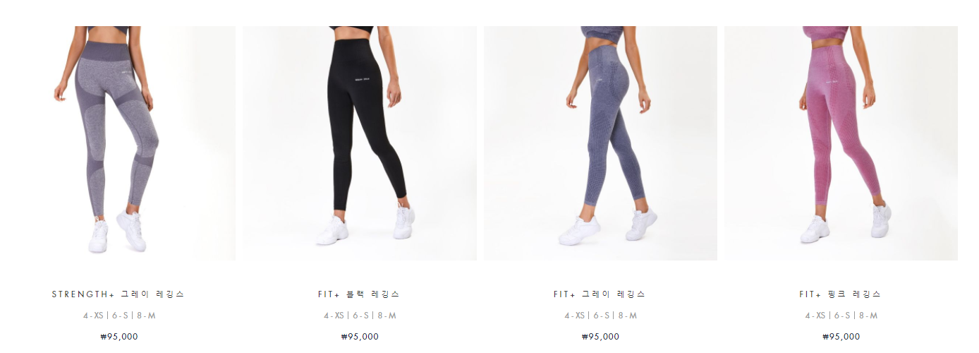 제품군은 간단하게 요가복 상의 그리고 레깅스 바지로 나눠져 있습니다. 컬러가 다양한 제품이 있는 반면, 원단 특성한 모던한 원 컬러로 나오기도 합니다.