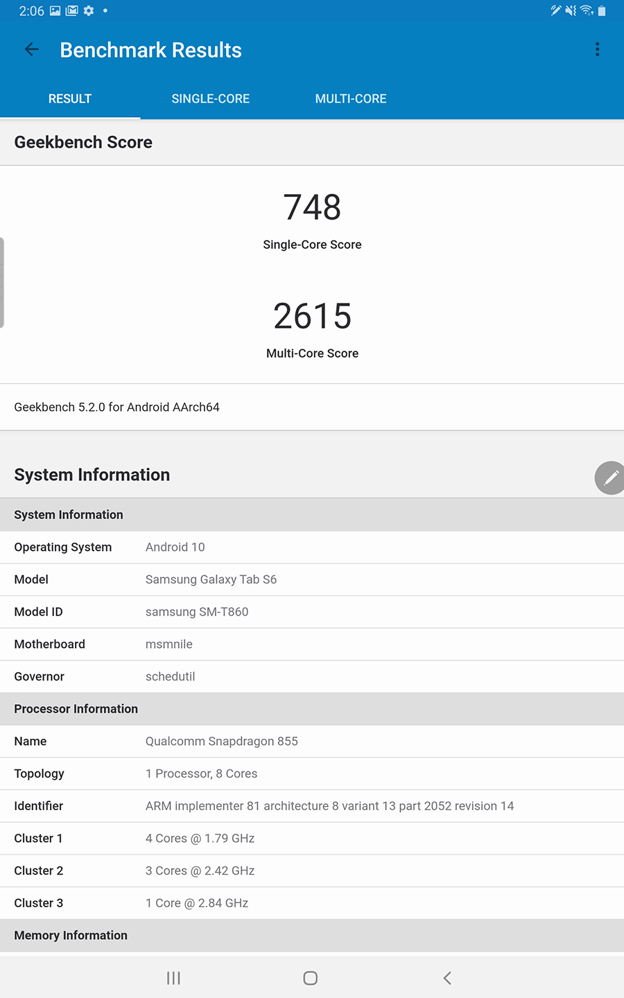 간단하게 돌려본 긱벤치5 벤치마크 결과입니다. Geekbench5 기준으로 싱글코어 748점, 멀티코어 2615점 입니다. 스냅드래곤 855의 성능을 가늠해볼 수 있네요. :)