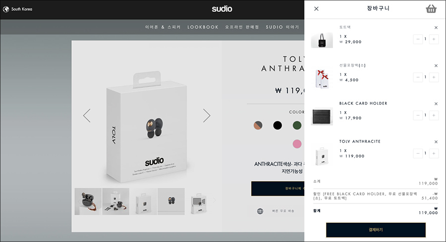 먼저 수디오 공식몰 사이트에 접속해서 원하는 이어폰 제품을 장바구니에 담습니다. 아마 추석 이벤트 기간이라서 자동으로 토트백, 선물포장팩, 그리고 카드지갑이 함께 담기게 될 거에요. 무료 이벤트 진행중이라 모두 공짜 사은품이니 안심하시고 '결제하기' 버튼을 클릭합니다.