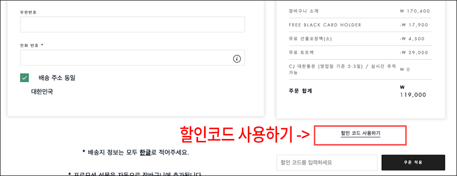 그 다음 화면에서 배송정보를 입력하게 되는데, 오른쪽 밑을 잘 보시면 '할인 코드 사용하기' 버튼이 보입니다. 클릭하고 아래에 'HAPPYCHUSEOK'이라고 대소문자 구분없이 입력하시면 할인 쿠폰이 적용됩니다.