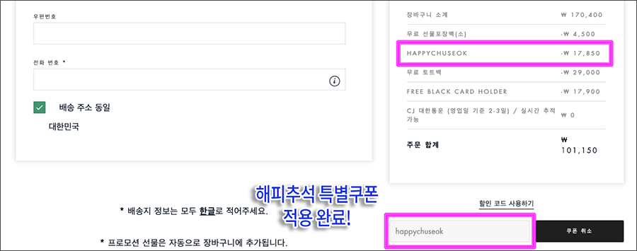 HAPPYCHUSEOK 쿠폰코드 사용하는 법