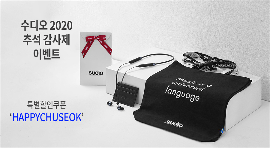 가장 먼저 2020년 9월 21일 부터 시작되는 추석 감사제 이벤트는, 재고 소진시까지 수디오 이어폰 제품을 구입하는 모두에게 세련된 디자인의 토트백(에코백), 카드지갑, 그리고 선물포장이 무료로 제공됩니다.