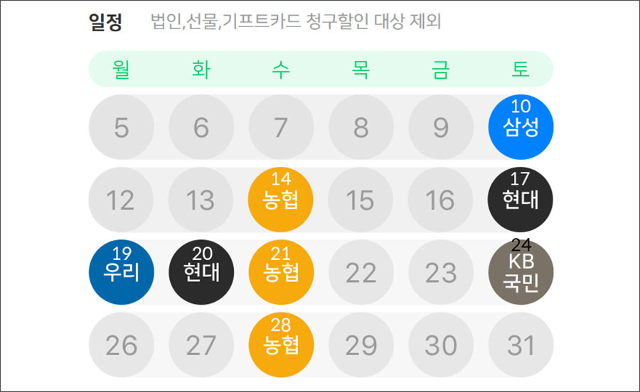 각 카드사마다 체크카드는 포함이 안될 수 있으니 (삼성, 현대 등등) 유의사항 꼭 확인하시고, 결제하실때 환급할인 예상가격이 뜨는지 보시면 됩니다. :)