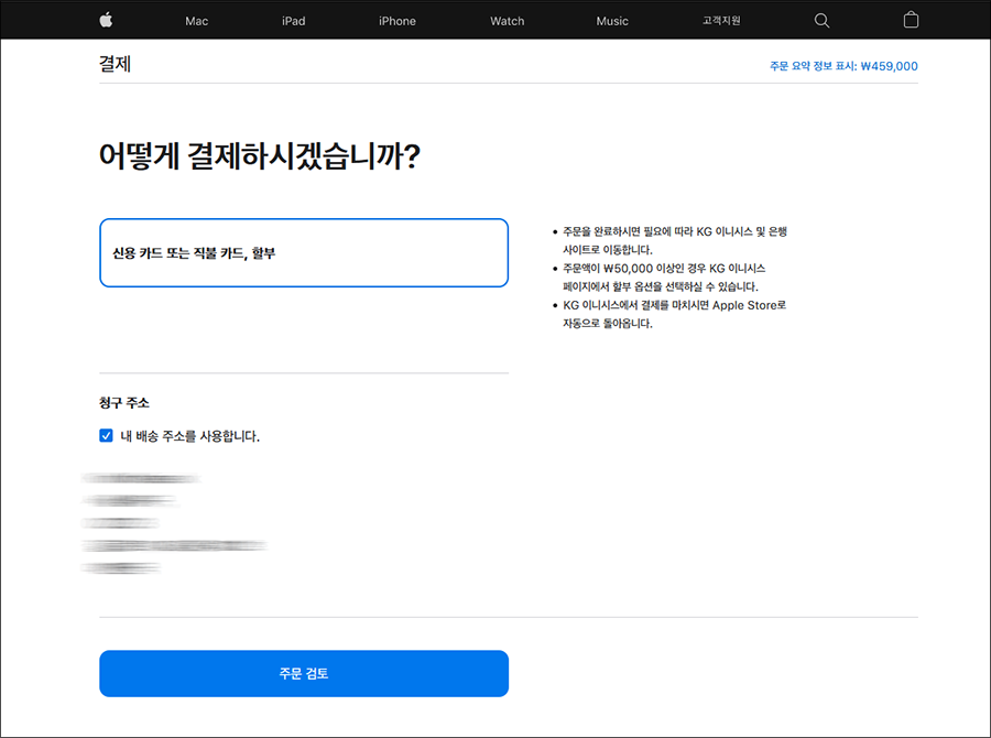 내가 고른 애플워치SE 사양이 맞는지 쭉 확인을 해주고, 주소지 한번 더 꼼꼼하게 확인을 한 뒤에, 결제를 합니다. 애플공홈에서는 KG이니시스로 연결되어 결제를 할 수 있습니다. 카드 무이자할부 정도도 확인하시구요. 저는 그냥 일시불로 삽니다.