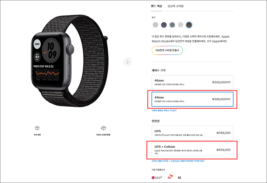 남자는 역시 블랙이죠. 그리고 44mm로 크기를 올리고, GPS + Cellular 셀룰러 버전을 선택했습니다.